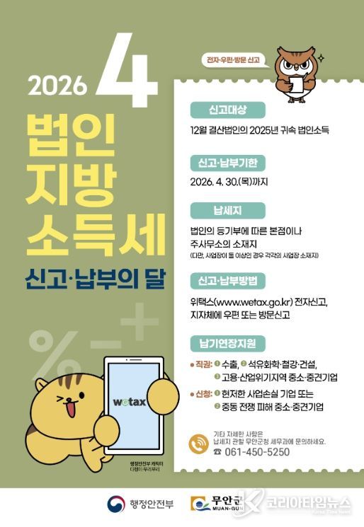 코리아타임뉴스 노승선 기자 | 전남 무안군은 법인 소득에 대해 지방자치단체에 납부하는 법인지방소득세 신고·납부 기간을 맞아 오는 4월 30일까지 집중신고기간을 운영한다고 밝혔다.