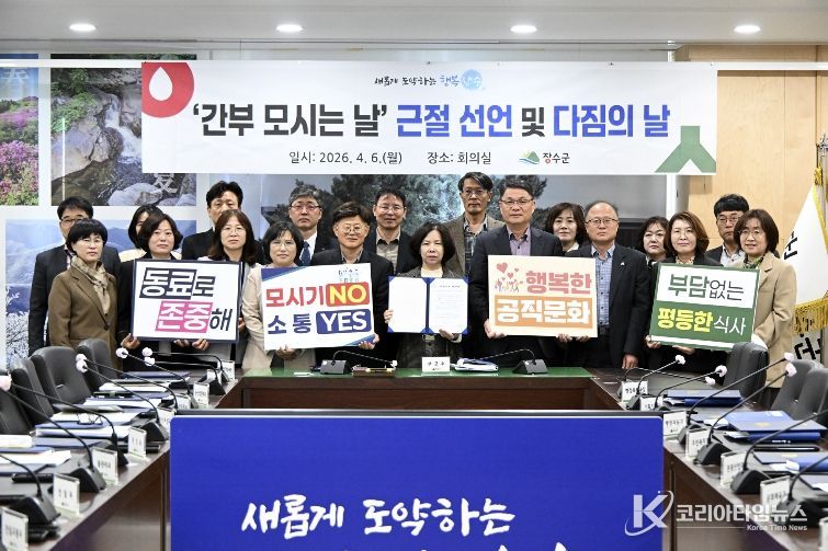 코리아타임뉴스 김태훈 기자 | 장수군은 6일 군청 회의실에서 공직사회 내 불합리한 관행을 개선하고 수평적인 조직문화를 정착시키기 위한 ‘간부 모시는 날’ 근절 선언 및 다짐의 날 행사를 개최했다고 밝혔다.