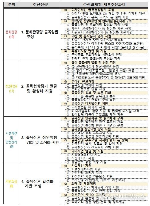 4대 전략과 38개 세부과제를 축으로, 3년간 총 212억 원 규모의 예산을 투입할 계획이다. 4대 전략은 ▲문화관광형 골목상권 조성 ▲골목형상점가 발굴 및 활성화 지원 ▲상인 역량 강화 및 조직화 지원 ▲골목상권 활성화 기반 조성으로 구성된다.
