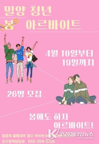 코리아타임뉴스 경남취재본부 | 경남 밀양시가 지역 청년들의 실무 경험과 역량 강화를 위해 올해부터 ‘춘계(봄 시즌) 청년 아르바이트’를 신설하고 참여자를 모집한다.