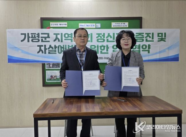 코리아타임뉴스 기동취재팀 | 가평군정신건강복지센터·자살예방센터는 지역사회 정신건강 증진과 자살 예방을 위해 청평우리병원과 업무협약(MOU)을 체결했다고 9일 밝혔다. 지난 7일 체결된 이번 협약은 최근 증가하는 정신건강 문제와 자살 위험군에 대한 대응 역량을 강화하기 위해 마련됐다.