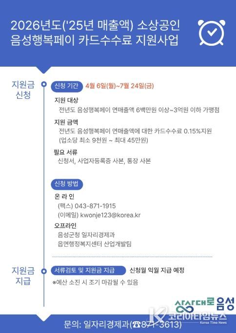 코리아타임뉴스 충북취재본부 | 음성군이 고물가·고금리로 인한 관내 소상공인 경영 부담 완화를 위해 ‘음성행복페이 카드수수료 지원사업’을 추진하고 있다.