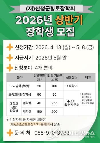 코리아타임뉴스 경남취재본부 | (재)산청군향토장학회는 오는 13일부터 5월 8일까지 ‘2026년도 상반기 장학금’을 신청받는다고 10일 밝혔다.