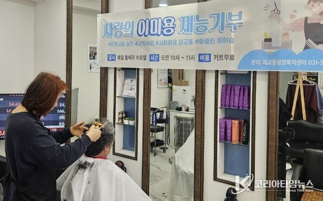 코리아타임뉴스 사회팀 | 수원시 팔달구 매교동 행정복지센터는 지난 8일 매교동 소재 마를린 헤어숍과 함께 ‘사랑의 이미용 서비스’를 실시했다. 이날 머리 손질을 희망하는 관내 어려운 이웃 16명에게 커트 및 드라이 서비스를 제공하며 따뜻한 나눔의 시간을 가졌다.