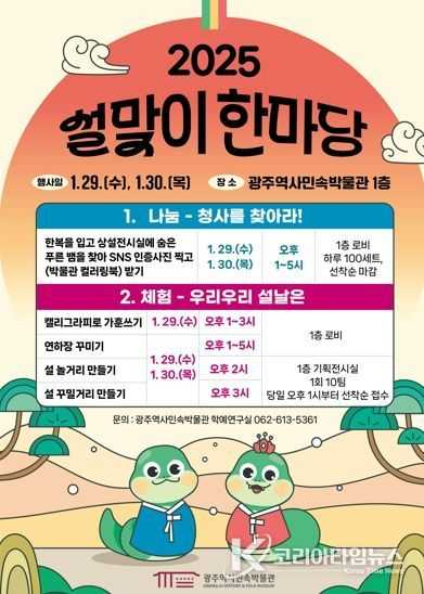 임찬혁 광주역사민속박물관장은 “시민들에게 푸른 뱀이 상징하는 새로운 도전과 성장 에너지를 선사할 수 있도록 다양한 나눔‧체험 프로그램을 준비했다”며 “설 연휴 박물관 나들이를 통해 희망을 채워가는 시간이 되기를 바란다”고 말했다.