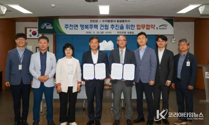 코리아타임뉴스 전북취재본부 | 전북특별자치도 진안군과 한국수자원공사 용담댐지사(지사장 강희완)는 23일 진안군청 상황실에서 주천면 행복주택 건립사업 시행 협약을 체결했다.