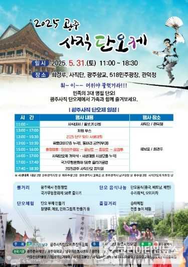 코리아타임뉴스 권충현 기자 | 광주광역시는 오는 31일 단오(端午, 음력 5월5일)를 맞아 남구 사직공원과 희경루 일원에서 전통 세시풍속을 재현하는 ‘2025 광주사직단오제’를 개최한다.