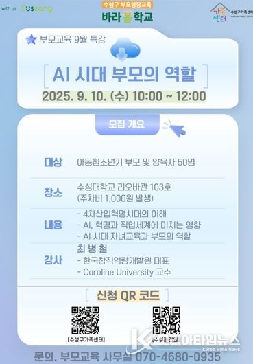 코리아타임뉴스 한장선 객원기자 | 대구 수성구가 운영하는 ‘부모성장교육, 바라봄학교’는 오는 10일 오전 10시 수성대학교 리오바관에서 아동·청소년기 자녀를 둔 부모 및 양육자를 대상으로 9월 부모교육 특강을 개최한다.