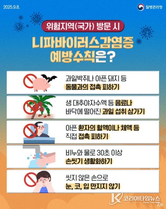 코리아타임뉴스 의료보건팀 | 질병관리청은 니파바이러스감염증을 제1급감염병으로 신규 지정하기 위해 9월 8일 고시를 개정·시행한다.