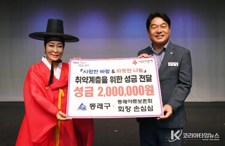 코리아타임뉴스 부산취재본부 | 부산 동래구는 지난 7일 제60주년 동래야류 정기발표공연‘2025 동래들놀음 축제’행사장에서 동래야류보존회 손심심 회장으로부터 어려운 문화예술인을 돕기 위한 이웃돕기 성금 200만 원을 전달받았다고 밝혔다.