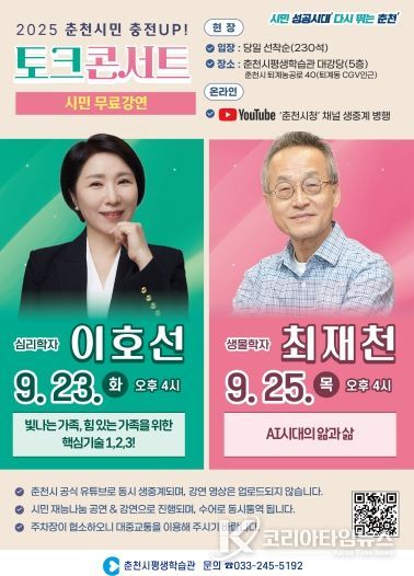 강연 전에는 평생학습 동아리 지원사업에 참여하고 있는 시민학습동아리 ‘시노리아’와 ‘춘천클래식기타앙상블’의 재능나눔 공연이 펼쳐져 시민들이 쌓아온 평생학습 성과를 함께 나눌 예정이다. 행사 당일 선착순 230명까지 입장 가능하며 별도 신청 없이 무료로 참여할 수 있다. 모든 강연에는 수어 통역이 제공되고 현장 강연뿐만 아니라 춘천시 공식 유튜브 채널을 통해 온라인으로 실시간 생중계된다.