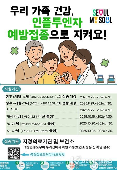 코리아타임뉴스 의료보건팀 | 서울시는 다가오는 겨울철 인플루엔자 유행에 대비해 시민 건강 보호에 나선다. 시는 오는 22일부터 내년 4월 30일까지 ▴어린이 ▴임신부 ▴65세 이상 어르신을 대상으로 연령대별 순차 무료 예방접종을 시행한다. 접종은 대상·연령별로 시기를 분산해 쏠림을 방지하고, 보다 안전한 접종을 유도할 계획이다.
