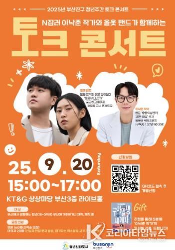 코리아타임뉴스 부산취재본부 | 부산진구는 오는 9월 20일 오후 3시, KT&G 상상마당 부산 3층 라이브홀에서 청년들을 위한 특별한 소통의 장, ‘2025 청년주간 토크콘서트’를 개최한다고 밝혔다.