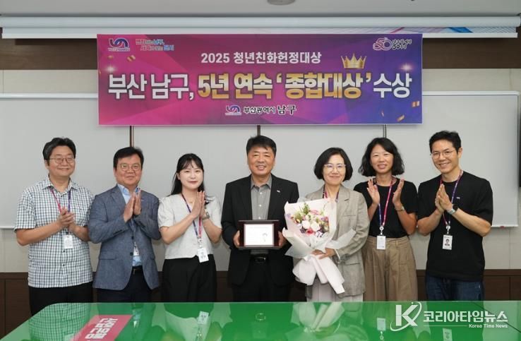 코리아타임뉴스 부산취재본부 | 부산 남구가 (사)청년과미래 주관 청년친화헌정대상에서 5년 연속 종합대상을 수상했다고 밝혔다.