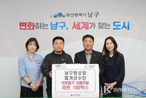 코리아타임뉴스 부산취재본부 | 남구 빙상장을 이용하는 어린이 피겨선수단이 지난 15일 부산광역시 남구(구청장 오은택)에 라면 100박스를 기부했다.