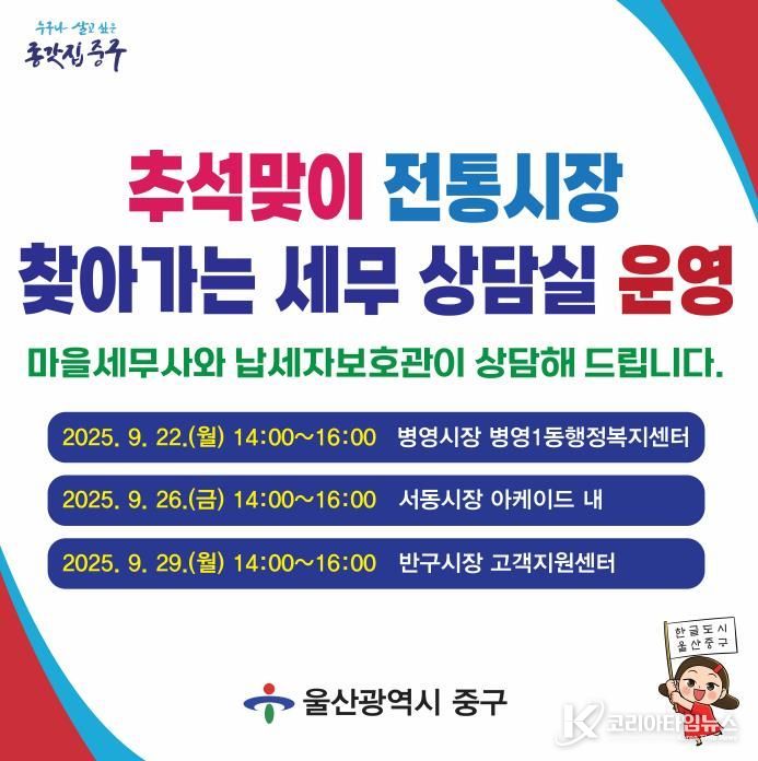 코리아타임뉴스 울산취재본부 | 울산 중구가 추석 명절을 앞두고 지역 내 전통시장 3곳에서 ‘찾아가는 마을세무사 무료 세무 상담’ 행사를 연다.