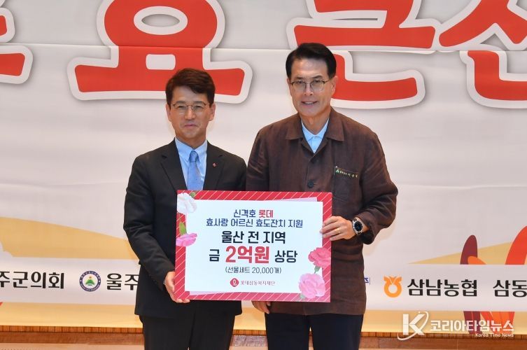 코리아타임뉴스 울산취재본부 | 롯데삼동복지재단(이사장 장혜선)이 울주군 12개 읍면 경로잔치에 참석하는 어르신을 위해 총 1억원 상당의 선물세트 1만개를 지원했다.
