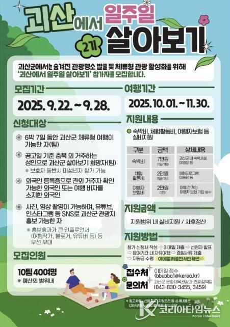 코리아타임뉴스 박찬식 기자 | 충북 괴산군은 오는 28일까지 ‘괴산에서 일주일 살아보기’ 참가팀을 모집한다고 22일 밝혔다.