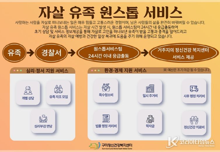 코리아타임뉴스 의료보건팀 | 구미시는 7월부터 자살로 갑작스럽게 가족을 잃은 유족들의 고통을 신속히 완화하고 안정적인 일상 복귀를 위해 '자살 유족 원스톱 서비스'사업을 본격 운영하고 있다.