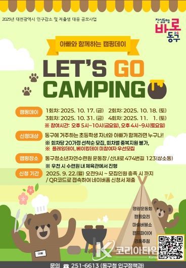 코리아타임뉴스 대전취재본부 | 대전 동구는 아빠의 육아참여 독려 및 일·가정 양립 환경 조성을 위해 추진하는 ‘아빠와 함께하는 신나는 하루’ 시리즈의 세 번째 프로그램인 ‘아빠와 함께하는 신나는 캠핑데이’ 참여자를 모집한다고 22일 밝혔다.
