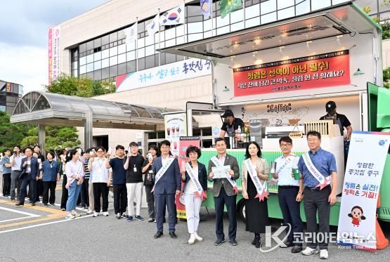 코리아타임뉴스 울산취재본부 | 울산 중구가 9월 22일 낮 12시 중구청 본관 입구에서 전 직원을 대상으로 ‘청렴 한 잔할래요’ 청렴 커피차 홍보활동(캠페인)을 진행했다.