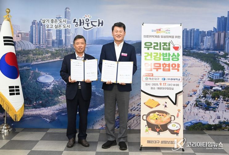 코리아타임뉴스 의료보건팀 | 해운대구는 국립부경대학교와 만성질환 의료급여수급자에게 맞춤형 식단을 안내하는 ‘우리 집 건강밥상 사업’을 추진하기로 하고 17일 업무협약을 체결했다.