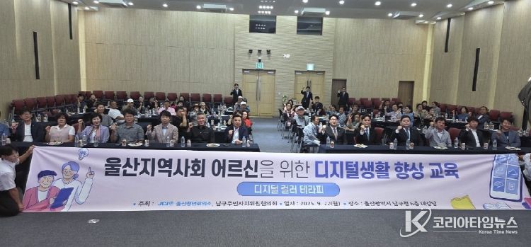 코리아타임뉴스 울산취재본부 | 남구주민자치위원협의회(회장 김태현)와 울산청년회의소(회장 손문호)는 22일 남구청 6층 대강당에서 어르신들을 위한 ‘디지털 역량강화 교육’을 열어 큰 호응을 얻었다.