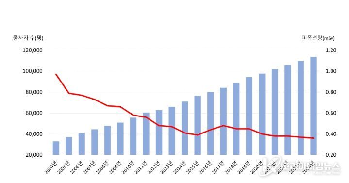 이번 연보에 의하면, 2024년 방사선관계종사자 수는 113,610명이고, 1인당 연간 평균 피폭선량은 0.36 mSv(밀리시버트)로 통계자료를 처음 발표한 2004년에 비해 방사선관계종사자 수는 3.4배(2004년 33,000명) 증가했으나, 피폭선량은 63% 감소(2004년 0.97 mSv) 한 것으로 확인됐다.