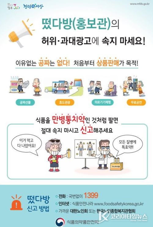 코리아타임뉴스 충북취재본부 | 청주시는 추석 명절을 앞두고 허위·과대 광고로 어르신 등에게 식품·건강기능식품을 비싸게 판매하는 행위인 이른바 ‘떴다방’에 대한 집중 점검을 오는 29일까지 실시한다고 24일 밝혔다.