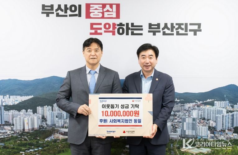 코리아타임뉴스 부산취재본부 | 부산 부산진구는 9월 23일, 사회복지법인 동일(대표이사 김종각)에서 부산진구청을 방문하여 이웃돕기 성금 1,000만원을 기탁했다고 전했다.
