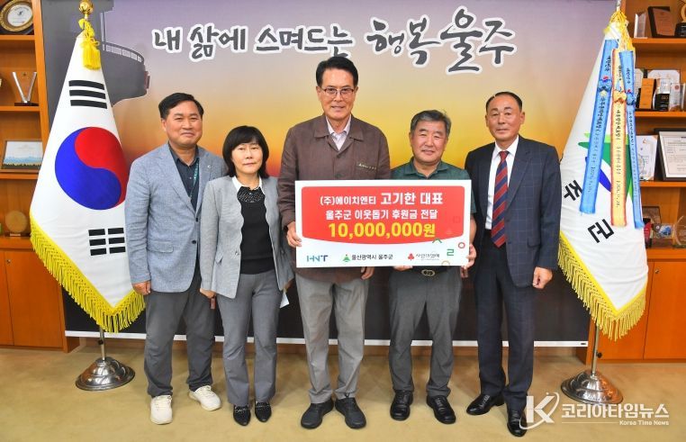 코리아타임뉴스 울산취재본부 | 고기한 ㈜에이치앤티 대표가 24일 울주군청 소회의실에서 이순걸 군수와 관계 공무원 등이 참석한 가운데 울주군 저소득층을 돕기 위한 성금 1천만원을 전달했다.