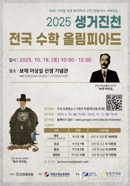 코리아타임뉴스 충북취재본부 | 충북 진천군은 오는 10월 18일 보재 이상설 선생 기념관에서 ‘2025 생거진천 전국 수학 올림피아드’를 개최한다고 25일 밝혔다.