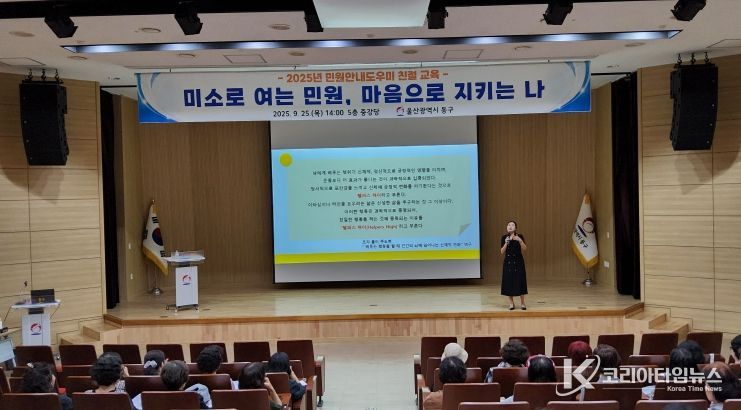 코리아타임뉴스 울산취재본부 | 울산 동구는 9월 25일 동구청 5층 중강당에서 구청과 보건소, 종합사회복지관의 자원봉사 민원 안내 도우미 60여 명을 대상으로 친절 교육을 했다.