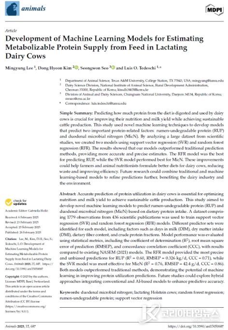 두 가지 예측 모형은 젖소에게 공급되는 핵심 단백질인 ‘반추위에서 분해되지 않고 소장에서 흡수되는 단백질(RUP)’과 ‘반추위 미생물이 사료를 분해하며 합성하는 단백질(MicN)’을 정확히 예측할 수 있도록 설계됐다.