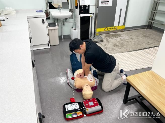 이번 훈련은 이용자가 남자 탈의실 내에서 심정지로 쓰러진 상황을 가정하여 진행됐으며, 실제상황 못지 않은 긴장감 속에서 신속한 초기 대응과 협력 체계를 점검하는 계기가 됐다.