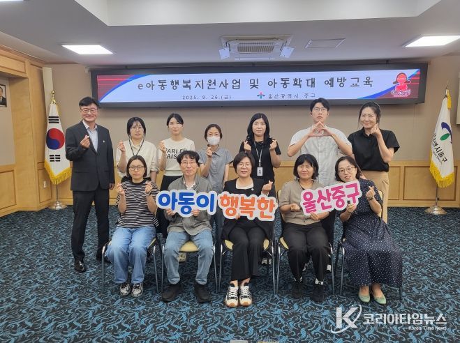 코리아타임뉴스 울산취재본부 | 울산 중구가 9월 26일 오후 4시 중구청 중회의실에서 12개 동(洞) 행정복지센터 아동 복지 업무 담당자 12명을 대상으로 ‘e아동행복지원사업 및 아동학대 예방교육’을 진행했다.