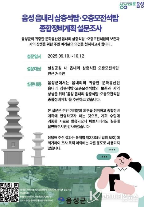 코리아타임뉴스 충북취재본부 | 음성군은 읍내리 설성공원 일원에 위치한 ‘음성 읍내리 삼층석탑’ 및 ‘음성 읍내리 오층모전석탑’의 종합정비계획을 수립하는 과정에서 주민 의견 수렴을 위한 온라인 설문조사를 실시한다고 밝혔다.