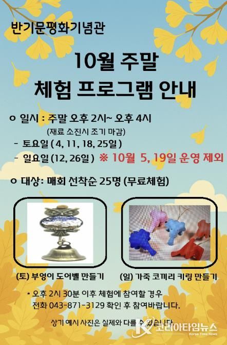 코리아타임뉴스 충북취재본부 | 음성군 제8대 유엔사무총장 반기문 평화기념관에서는 관람객을 위해 10월 주말 무료 체험 프로그램을 운영한다.