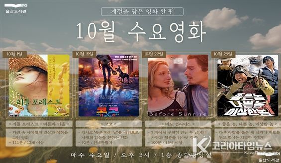 코리아타임뉴스 울산취재본부 | 울산도서관이 10월 한 달간 매주 수요일 오후 3시 도서관 1층 종합영상실에서 ‘계절을 담은 영화 한 편’을 주제로 영화를 상영한다.
