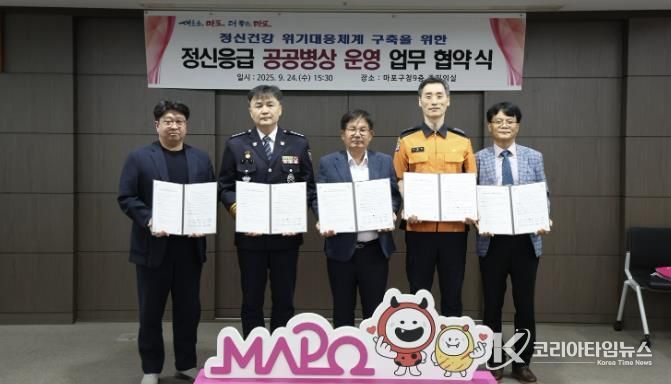 코리아타임뉴스 윤경수 기자 | 마포구는 9월 24일, 구청 9층 중회의실에서 ‘정신응급 공공병상 운영’을 위한 업무협약식을 열고, 고위험 정신질환자에 대한 24시간 신속 입원·치료 체계를 본격 가동했다.