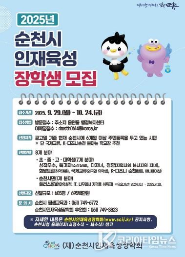 신청은 오는 10월 24일까지 주소지 읍·면·동 행정복지센터 또는 이메일을 통해 가능하며, 국제교류 장학금과 K-디즈니순천 장학금은 학교장의 추천을 받아 선발한다. 선발 결과는 11월 말에 발표되며, 12월 중 장학금이 지급될 예정이다.