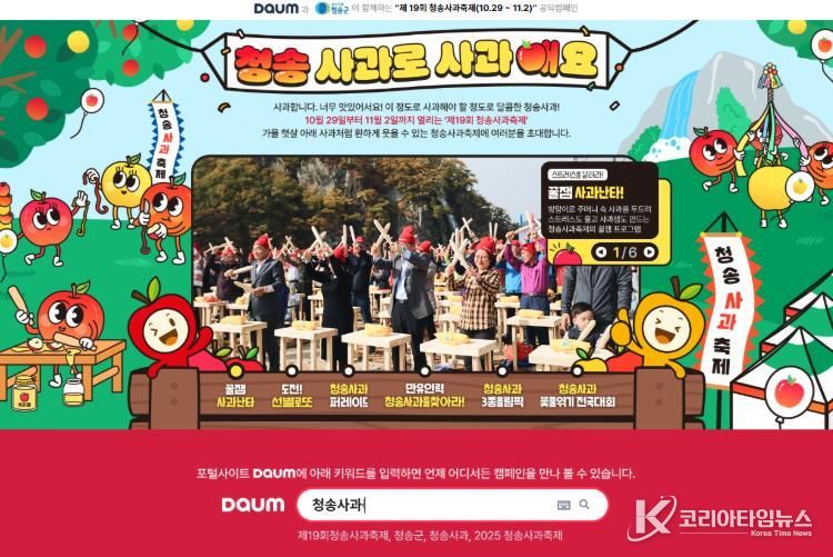 코리아타임뉴스 윤경수 기자 | 청송군은 29일부터 포털사이트 다음(daum)에서 11월 2일까지 '제19회 청송사과축제' 온라인 축제를 개최한다.