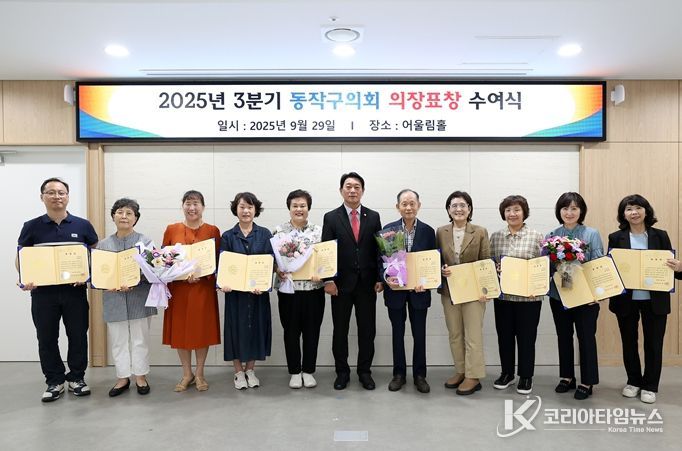 코리아타임뉴스 윤경수 기자 | 동작구의회는 29일 의회 어울림홀에서 지역사회 발전에 기여한 ‘사당2동 자율방재단’ 등 3개 단체와 모범 구민 49명에게 의장 표창을 수여했다.