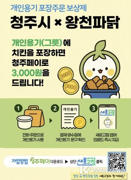 코리아타임뉴스 충북취재본부 | 청주시는 10월 1일부터 ‘새로고침’ 모바일앱을 통해 전국 최초 개인용기 포장주문 보상제를 시행한다. 참여자에게는 지역화폐인 청주사랑상품권(청주페이) 3천원이 보상으로 지급된다.