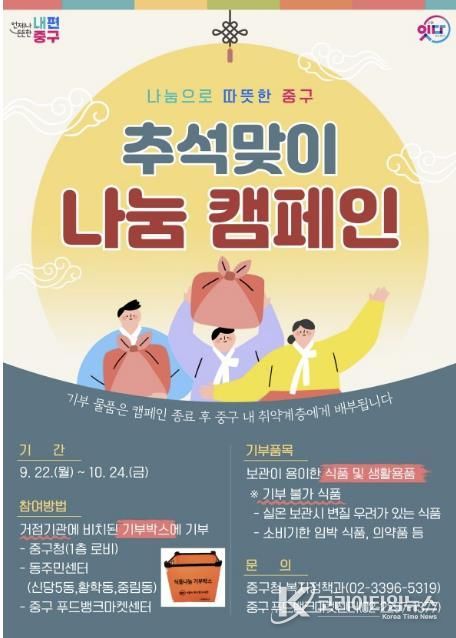 코리아타임뉴스 윤경수 기자 | 서울 중구가 다가오는 추석 명절을 앞두고 어려운 이웃을 돕기 위해 '2025 추석맞이 나눔 캠페인'을 진행한다. 이번 캠페인은 지난 22일부터 오는 10월 24일까지 4주간 이어지며, 주민들의 따뜻한 동참으로 풍성한 명절 나눔을 실천할 예정이다.