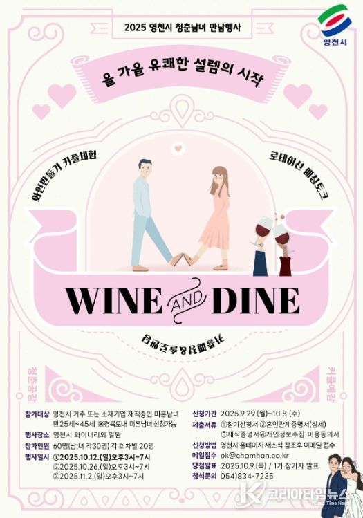 코리아타임뉴스 윤경수 기자 | 영천시는 오는 10월 12일, 10월 26일, 11월 2일 세 차례에 걸쳐 관내 와이너리에서 미혼남녀를 위한 특별한 만남 프로그램 ‘2025 영천愛 와인·다인(wine·dine)’을 개최한다.