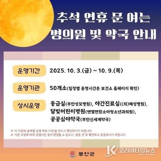 코리아타임뉴스 의료보건팀 | 부안군은 10월 3일부터 10월 9일까지 응급환자 진료와 대량 환자 발생에 대비하고자 '추석 연휴 응급진료체계'를 가동한다고 밝혔다.