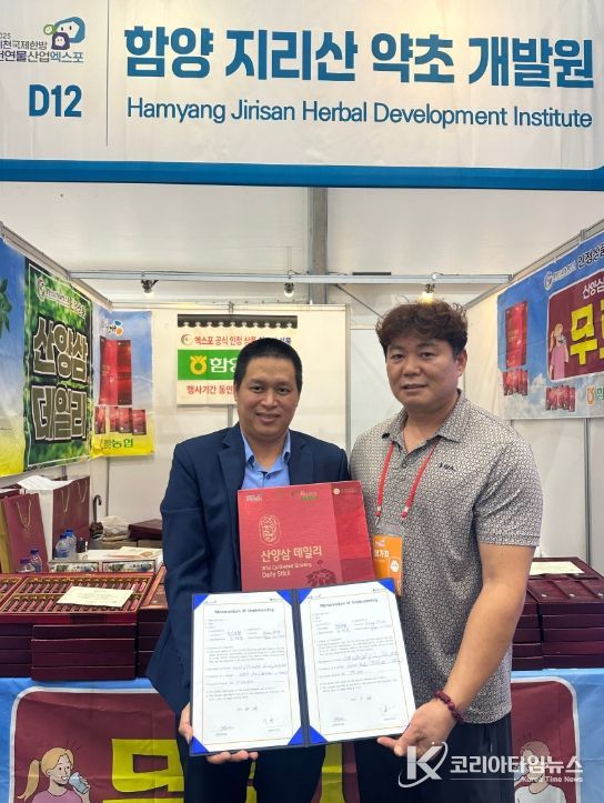 코리아타임뉴스 충북취재본부 | 경남 함양농협에서 운영하는 지리산약초개발원이 2025제천국제한방천연물산업엑스포에서 해외 기업과 연달아 수출협약을 체결하며 주목받고 있다.