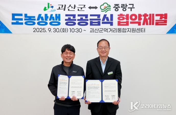 코리아타임뉴스 박찬식 기자 | 충북 괴산군은 30일 괴산군먹거리통합지원센터에서 서울특별시 중랑구와 도농상생 공공급식 협약을 체결했다고 밝혔다.