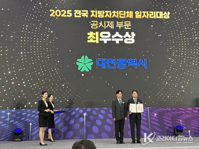 코리아타임뉴스 대전취재본부 | 대전시는 30일 청주 오스코에서 열린 고용노동부 주관 ‘2025 전국 지방자치단체 일자리대상’ 시상식에서 ▲일자리 공시제 부문 최우수상 ▲우수사업 부문 우수상을 동시에 받으며 4년 연속 수상의 영예를 안았다.